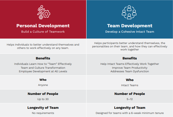 The Five Behaviors® solutions can help you activate your team’s ability to drive results through cohesive teamwork, whether it is with our Personal Development solution which helps individuals learn the skills they need to “team” effectively on any team and build a culture of teamwork, or our Team Development solution which helps intact teams gain the know-how to work better together.